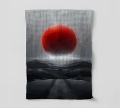Cette illustration numérique montre la descente audacieuse de deux courageux parachutistes au-dessus d'un paysage désertique rouge. Le terrain en contrebas est une vaste étendue stérile de dunes de sable cramoisies.