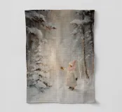Scène hivernale paisible représentant un enfant vêtu d'un manteau blanc et d'une écharpe rose, qui tend la main vers un petit arbre enneigé illuminé, entouré de grands arbres enneigés.