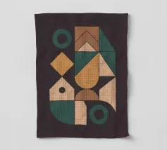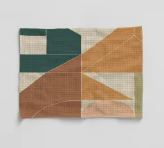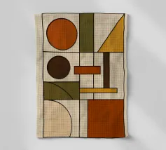 Une œuvre d'art abstraite composée de formes géométriques dans les tons vert terre, orange et beige, disposées de manière équilibrée sur un fond clair texturé.