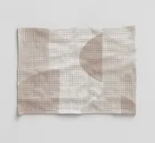 Le motif présente un arrangement captivant de cercles, de rectangles et de feuilles abstraites qui se chevauchent, évoquant subtilement des formes organiques dans son cadre structuré. La texture granuleuse ajoute de la profondeur et de l'intérêt visuel.