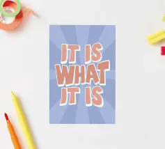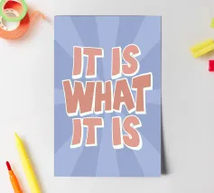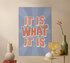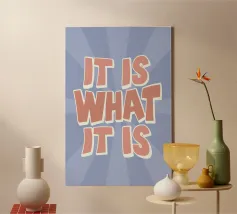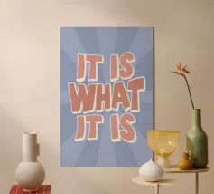 Profitez d'un moment d'acceptation grâce à cet imprimé graphique audacieux comportant la phrase "IT IS WHAT IT IS" (c'est ce que c'est). Réalisée en lettres bulles roses bien visibles sur un fond bleu dynamique et rayonnant, cette œuvre d'art délivre un message clair et percutant. Produite en tant qu'impression numérique de haute qualité avec une résolution impressionnante de 7000x5000 pixels à 300 dpi, elle garantit un niveau de détail exceptionnel et une fidélité des couleurs brillante, convenant à l'impression dans différentes tailles. Parfait pour ajouter une touche de style rétro, une citation directe et un élément de déclaration dans votre salon, votre bureau ou votre chambre à coucher.