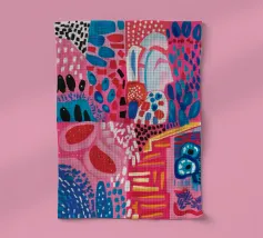 Une composition abstraite vibrante et ludique présentant un ensemble de formes organiques, semblables à des taches, dans des bleus, des roses et des jaunes audacieux. Les formes spontanées et les couleurs énergiques créent un sentiment d'expression artistique joyeuse.