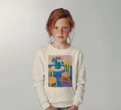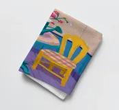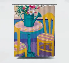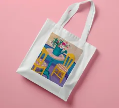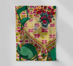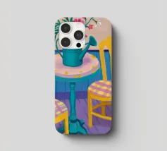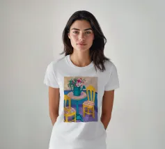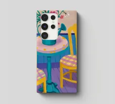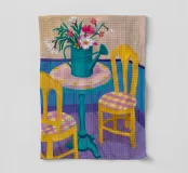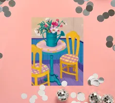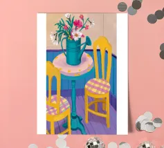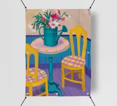 Une scène accueillante avec un vase de fleurs bleu sur une petite table entre deux chaises jaunes. La composition est gaie, équilibrée et évoque la simplicité agréable d'une conversation à l'heure du thé avec un ami.
