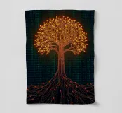 Une représentation envoûtante, éclairée au néon, d'un arbre dont chaque branche et chaque feuille est une carte de circuit imprimé lumineuse. Ses racines complexes et tentaculaires sont reliées à un sol sombre et stylisé, tandis que l'arrière-plan est rempli de flux de code binaire vert en cascade, mêlant nature et technologie. Cette œuvre symbolise magistralement la relation entre la vie organique et le monde numérique. Elle est parfaite pour tous ceux qui apprécient l'esthétique de la technologie, le cyberpunk ou l'art abstrait.