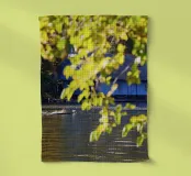 Un coup d'œil serein à travers des feuilles vertes floues révèle un lac tranquille et une maison bleue partiellement cachée reposant sur ses eaux. Au loin, une petite volée d'oiseaux se rassemble sur une parcelle de terre, ajoutant une douce touche de vie au calme. La mise au point en couches invite le spectateur à entrer dans une scène d'intimité et de découverte, comme s'il jetait un coup d'œil dans un monde secret. Idéal pour : les salons confortables, les coins lecture, les intérieurs inspirés par la nature ou les espaces de retraite où le calme et la contemplation sont appréciés.