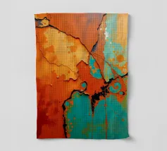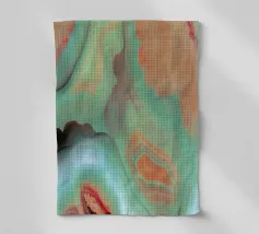 Des motifs tourbillonnants d'orange, de bleu et de brun s'écoulent sur un fond vert pâle, créant une composition dynamique et fluide. Les couleurs se mélangent et se fondent harmonieusement, évoquant l'aspect des surfaces marbrées.
