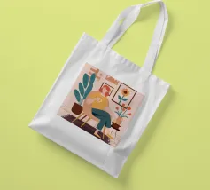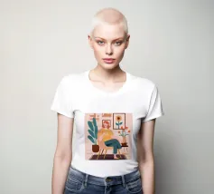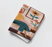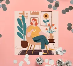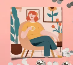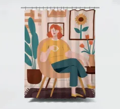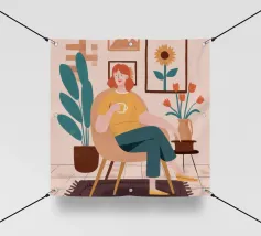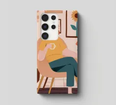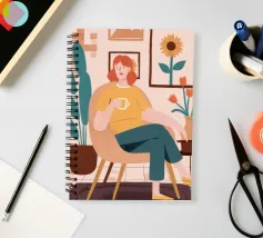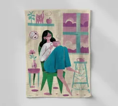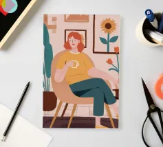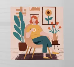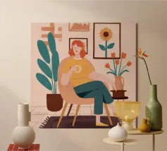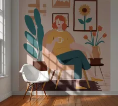 Une femme sirote son café matinal en se relaxant dans un fauteuil confortable, accompagnée de son chat, d'un livre et d'un grand tournesol dans un vase.