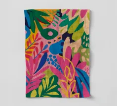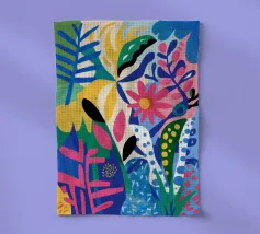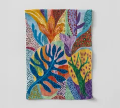 La fusion de champs géométriques et d'esquisses botaniques crée une jungle de sérénité sauvage, semblable à une courtepointe.