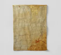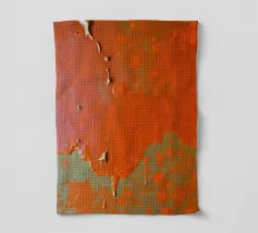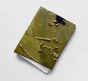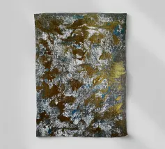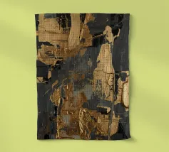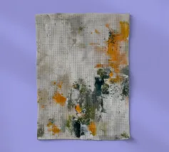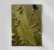 Cette œuvre d'art présente une surface texturée dominée par des teintes terreuses jaunes et vertes, soulignant un style abstrait unique qui invite à l'interprétation.
