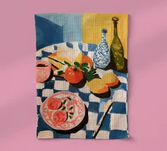 An elegant table set with a bowl of fruit, vibrant flowers and a wine glass creates a harmonious Mediterranean atmosphere. The contemporary painting and vibrant colours make this still life an eye-catcher in any room.