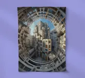 Une scène architecturale étonnante présentant des bâtiments cylindriques futuristes aux motifs géométriques complexes, vus d'une perspective en forme de tunnel vers le ciel. La conception combine des structures innovantes et des éléments visuels audacieux pour un concept urbain captivant.