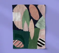 Un paysage abstrait est déconstruit en formes géométriques et en couleurs vives, représentant un soleil, des collines et des feuillages dans une composition fragmentée mais harmonieuse sur un fond sombre.