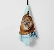 Illustration charmante et sophistiquée d'un capybara vêtu d'une chemise bleue impeccable et d'un nœud papillon à motifs.