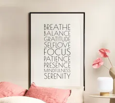 Une déclaration typographique en trois mots puissants : GOOD - VIBES - ONLY. Chaque mot dans une couleur différente, chaque ligne avec une longue ombre - visuellement fort, émotionnellement clair. Le fond vert pastel apporte de la légèreté, tandis que le rouge, le bleu et le jaune représentent l'énergie, le calme et l'optimisme.