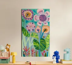 Une composition abstraite vibrante et complexe qui ressemble à une courtepointe en patchwork, avec des panneaux distincts remplis de feuilles stylisées, d'éléments floraux et de motifs abstraits dans un riche éventail de couleurs. L'arrangement organisé mais ludique crée un sentiment d'art artisanal.