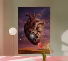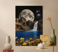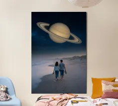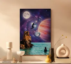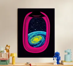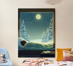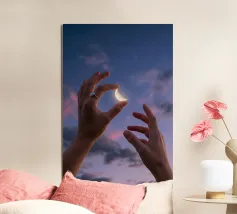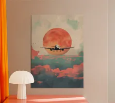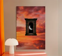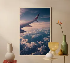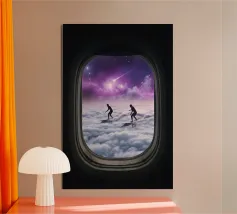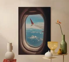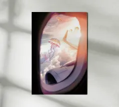 Découvrez la magie du voyage et du ciel nocturne grâce à cette œuvre d'art atmosphérique représentant une main qui touche délicatement le hublot d'un avion surplombant des dunes désertiques rougeoyantes. Un croissant de lune brille dans un ciel bleu profond rempli d'étoiles, créant un mélange serein d'errance et d'émerveillement. Les sables chauds et dorés contrastent magnifiquement avec les tons frais de la nuit, capturant le sentiment de solitude, de réflexion et de rêve au-dessus du monde. Parfait pour les amateurs de voyages, les minimalistes et les fans d'art cinématographique et de vues de fenêtre rêveuses.