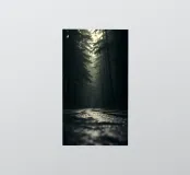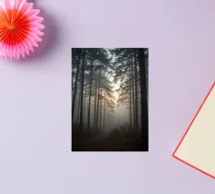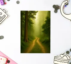 Un sentier forestier serein, enveloppé de brume, est bordé de grands arbres qui se dressent majestueusement. Une lumière douce traverse la canopée, créant une atmosphère tranquille.