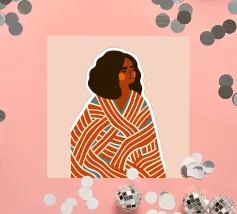 Portrait d'une femme aux yeux fermés et au sourire doux, vêtue d'un pull à rayures. Son expression sereine crée une atmosphère de paix, de contentement et d'apaisement profond.