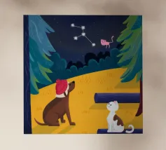 This artwork depicts a grumpy-looking cloud with a thought bubble containing a bird and a bear. The humorous and imaginative scene is set against a soft blue background.