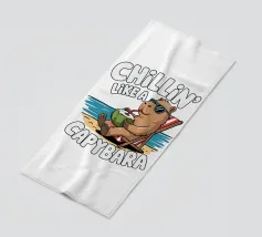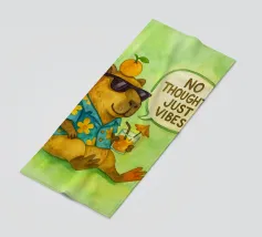 Un joyeux capybara portant des lunettes de soleil se prélasse sur un banc en dégustant une pastèque dans une ambiance tropicale. Le texte au-dessus indique "I'M NOT LAZY" et en dessous, "I'M JUST ON CAPYBARA TIME".