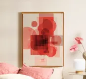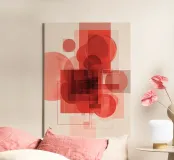 Une composition audacieuse et moderniste où la géométrie rencontre le sentiment - des cercles et des rectangles qui se chevauchent dans des tons cramoisis et corail profonds forment un rythme visuel à la fois structuré et expressif. Cette pièce évoque la clarté du Bauhaus avec une touche d'abstraction chaleureuse, parfaite pour les intérieurs qui privilégient l'équilibre, la couleur et la simplicité conceptuelle.