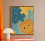 L'illustration joyeuse représente un adorable chat orange à côté de pièces de puzzle colorées.