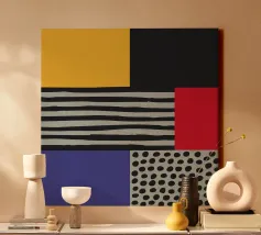 Ce design frappant combine des lignes courbes en noir avec des accents de couleurs vives en bleu, rouge et jaune. La combinaison de contrastes et de formes vivantes fait de ce motif un véritable accroche-regard. Parfait pour les amateurs d'art moderne et de styles boho, il confère aux peintures murales, coussins, tasses ou coques de téléphone portable un dynamisme et une créativité uniques. Que ce soit pour la maison ou comme cadeau inspirant, ce design apporte une expression artistique à tout environnement.