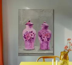 A vibrant still life displays a collection of colorful vases (purple, blue, striped), bowls, and decorative objects artfully arranged on a bright yellow tabletop against a pink and green segmented wall.
