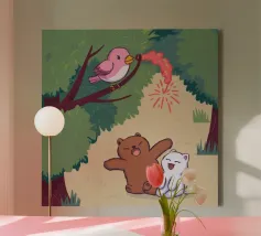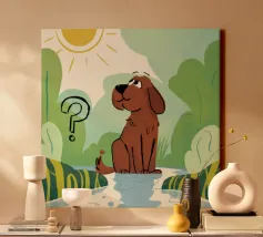 Cette œuvre d'art représente un nuage à l'air grincheux avec une bulle de pensée contenant un oiseau et un ours. La scène humoristique et imaginative se déroule sur un fond bleu doux.