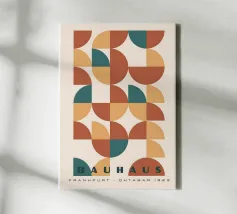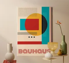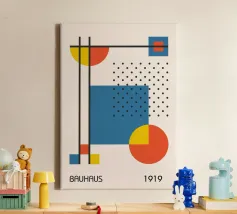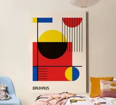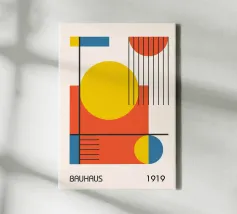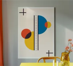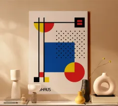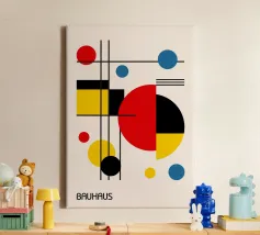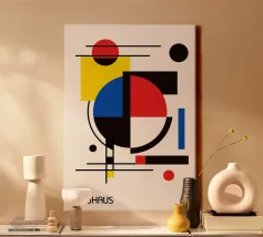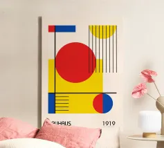 Affiche abstraite fortement inspirée par l'œuvre du maître du Bauhaus, Wassily Kandinsky, présentant un cercle dominant et segmenté dans les couleurs primaires rouge (vermillon) et bleu, divisé horizontalement par une fine bande jaune. La composition repose sur une délicate grille de fines lignes noires qui se croisent, avec un petit carré jaune, des pointillés et une croix noire qui ajoutent des détails minimalistes. Cette pièce géométrique illustre parfaitement l'équilibre entre la couleur, la ligne et la forme, caractéristique de l'art abstrait. Ce téléchargement numérique de haute qualité (7000x5000 pixels, 300 dpi) offre une reproduction nette, digne d'un musée.