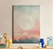 Une illustration douce et pastel de la pleine lune dans un ciel avec des nuages, avec des oiseaux en vol dans le style de Monet, créant une atmosphère éthérée et rêveuse. Les couleurs doivent être des roses doux, des bleus et des verts, avec des dégradés subtils pour la profondeur. Utilisez des textures aquarelles pour créer un sentiment vintage. Ce design est idéal en tant qu'impression sur toile ou en tant que poster, qui confère chaleur et tranquillité à n'importe quelle pièce.