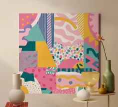 Un motif abstrait combine des blocs de couleurs semblables à des patchworks avec des gribouillis et des rayures énergiques, créant ainsi un design dynamique, ludique et artistique.