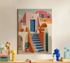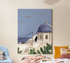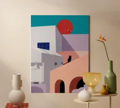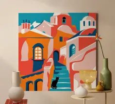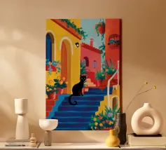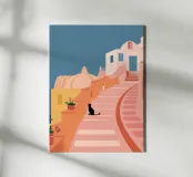 Charmante illustration d'un chat noir assis sur les marches d'une belle ville de bord de mer, dont les bâtiments sont peints en rose tendre. La scène est paisible, pittoresque et pleine de charme méditerranéen.
