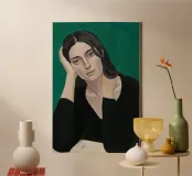 Portrait plein d'âme d'une jeune femme aux cheveux noirs, vêtue d'un simple haut noir. Elle repose sa tête sur sa main, son expression est pensive et mélancolique, sur un fond vert foncé qui renforce l'ambiance introspective.