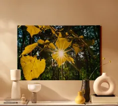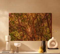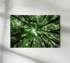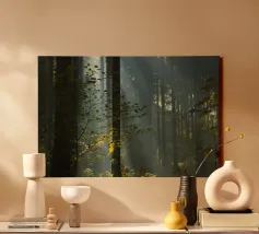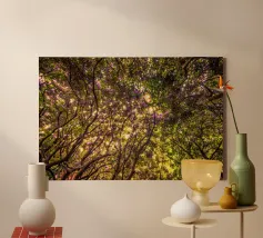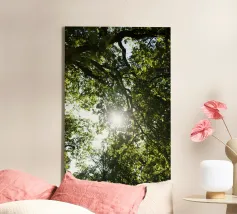 Lumière du soleil filtrant à travers des arbres denses et verts dans le calme toile