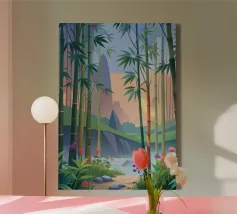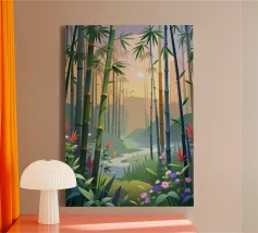 Illustration d'une forêt de bambous paisible et tranquille, avec une composition équilibrée et des couleurs harmonieuses, créant une atmosphère confortable et apaisante.