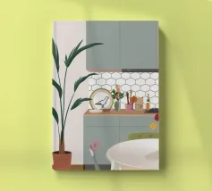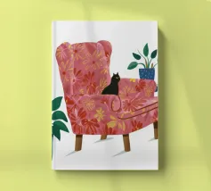 Illustration d'un coin lecture avec un fauteuil jaune confortable, un lampadaire et une table d'appoint avec une plante. Cette scène est un sanctuaire chaleureux, accueillant et parfait pour la lecture et la relaxation.