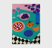 Une vibrante nature morte d'un dîner sur le toit ou d'un aperitivo, avec des pizzas, du vin et des fruits sur un fond bleu profond. Cette scène est une représentation chic et délicieuse des loisirs urbains.