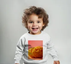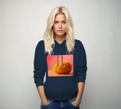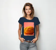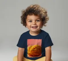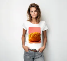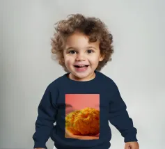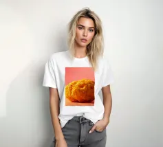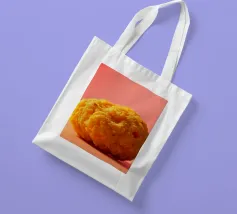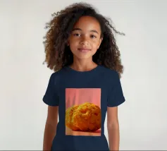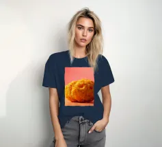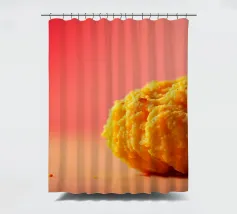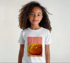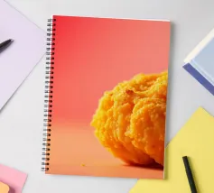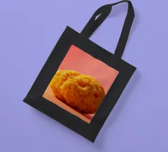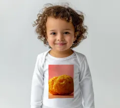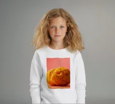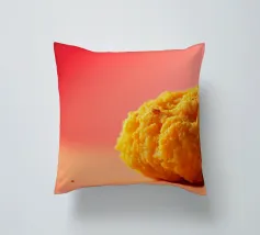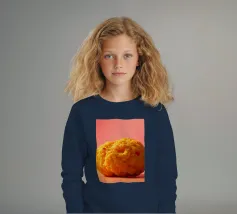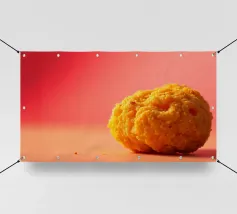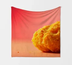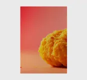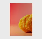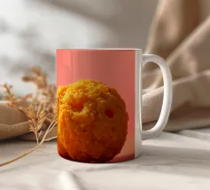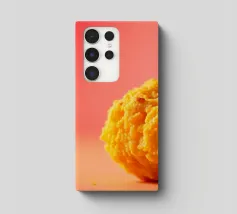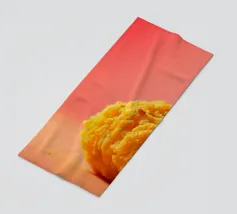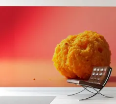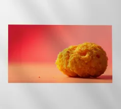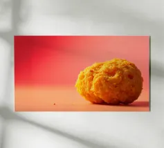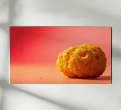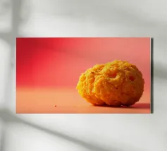 Un en-cas sphérique d'un jaune éclatant est posé sur une surface plane, contrastant avec une toile de fond chaude et colorée. La scène dégage une atmosphère joyeuse, qui plaira aux amateurs d'en-cas.