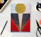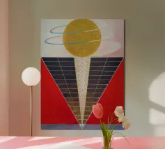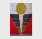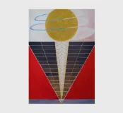 La dernière trilogie des Peintures pour le temple d'Hilma af Klint. Alors que le premier retable se concentrait sur l'ascension vers le divin, le retable n° 2 représente l'inverse : la descente de l'énergie spirituelle dans le monde matériel. La composition présente une étonnante pyramide dorée inversée, avec une large base au sommet, qui se rétrécit vers le bas à travers un spectre rythmé de bandes aux couleurs de l'arc-en-ciel. Couronnée par un disque solaire doré brillant, l'œuvre symbolise l'ancrage de la sagesse cosmique et la double nature de l'existence. Sa géométrie audacieuse et sa palette de couleurs radieuses en font un chef-d'œuvre fondamental