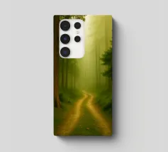 Un sentier forestier serein, enveloppé de brume, est bordé de grands arbres qui se dressent majestueusement. Une lumière douce traverse la canopée, créant une atmosphère tranquille.
