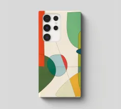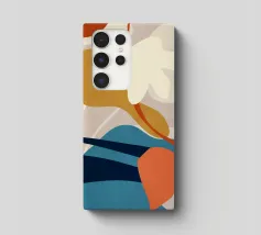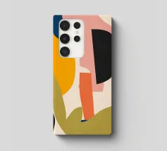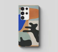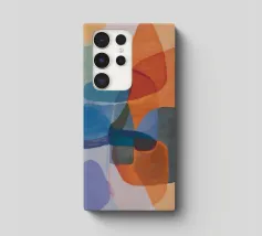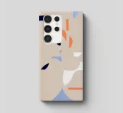 Des formes abstraites sont disposées sur un fond pâle, créant une composition qui suggère un profil facial fragmenté. Des couleurs vives telles que le bleu, l'orange et le noir sont utilisées pour les éléments géométriques, contrastant avec la toile de fond subtile.