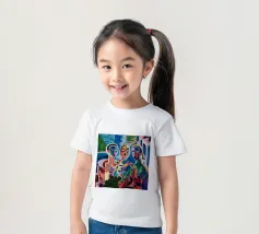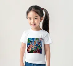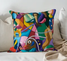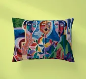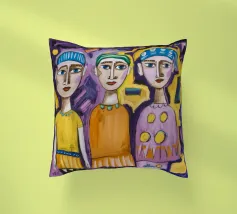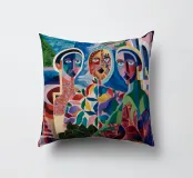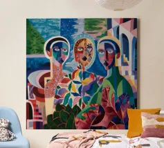 Cette œuvre d'art représente trois personnages dans un style abstrait, sur un fond coloré. La composition comprend des formes géométriques et des motifs, créant une scène vivante et dynamique.