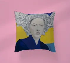 Portrait délicat d'une femme aux cheveux blonds ou châtains clairs, les yeux fermés ou regardant vers le bas, portant un vêtement bleu et argenté ou blanc aux détails complexes, évoquant la dentelle ou l'armure.