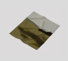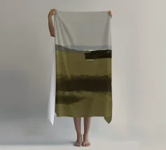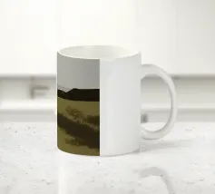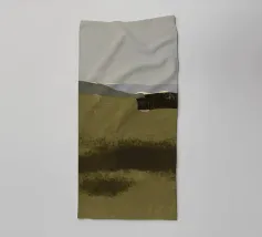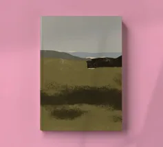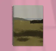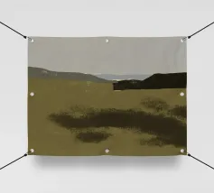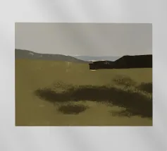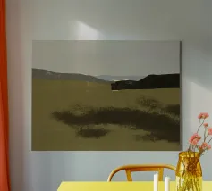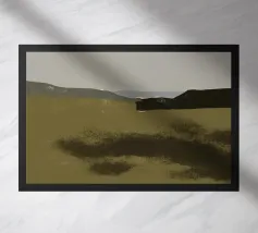 Un paysage serein présente des tons terreux atténués, avec un terrain accidenté qui s'étend vers un horizon brumeux. Les ombres et les contrastes mettent en valeur les collines lointaines, évoquant un sentiment de calme et d'immobilité.