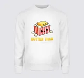 Un dessin animé mignon représente une boîte de pop-corn souriante avec un bloc de beurre sur le dessus, entouré de petits cœurs. Le texte dit avec humour : "Je t'aime plus que n'importe qui d'autre !".