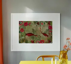 Un collage d'illustrations vintage vibrant présentant de magnifiques perroquets verts colorés perchés au milieu d'un paysage floral luxuriant. La scène déborde d'allure tropicale et exotique, car les perroquets se détachent sur la toile de fond du feuillage vibrant de la jungle. D'étonnantes fleurs exotiques fleurissent autour d'eux, tandis que des branches de palmier ajoutent une touche d'élégance tropicale. À l'arrière-plan, une carte ancienne apparaît doucement, ajoutant un sentiment d'aventure et de voyage. Ce mélange harmonieux de nature, d'animaux sauvages et de charme vintage crée un design intemporel, parfait pour les amateurs de paysages exotiques et d'art nostalgique.