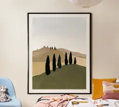 Une étude minimaliste de collines ondulantes et de vallées bordées de vignobles, rendue dans des ocres chauds, des prunes profondes et des tons de terre sourds. Inspirées des paysages viticoles, les formes épurées et les doux dégradés évoquent le calme ensoleillé des champs fertiles et des vendanges, distillant l'essence de la viticulture rurale dans une forme pure et abstraite.