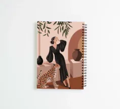 This artwork captures a person in a black dress striking a poised pose beside a leopard. The scene exudes sophistication, confidence, and timeless artistry.