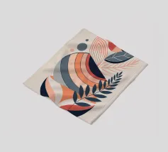 Composition abstraite moderne de diverses formes botaniques stylisées et de feuilles dans une palette de terracotta, de beige et de bleu foncé sur un fond clair.